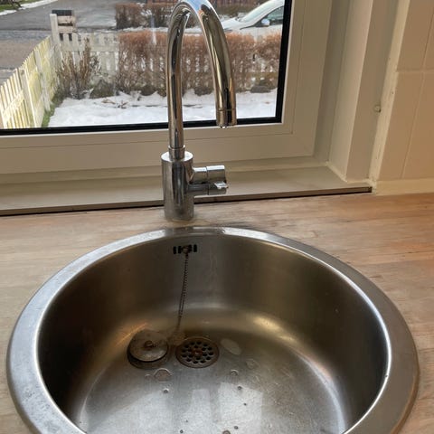 Ældre rund køkkenvask i bordplade m/Oras vandhane, Håndvask, vask