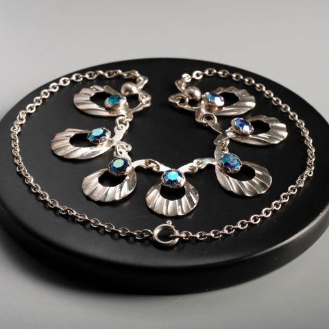 Retro halskæde og ring. “Stenen” er af ben (ved ikke hvilken slags) lavet af Herman Siersbøl. Ringens diameter er ca 1,9 cm. Kan sendes mod betaling af porto eller hentes i Vinge, 3600.