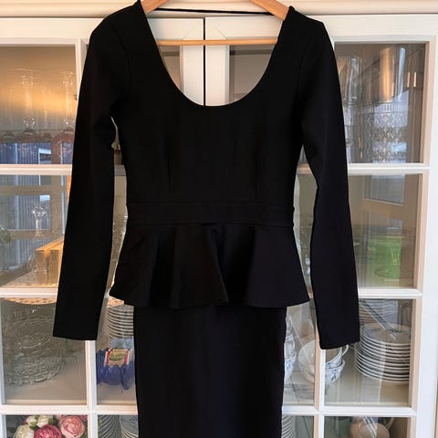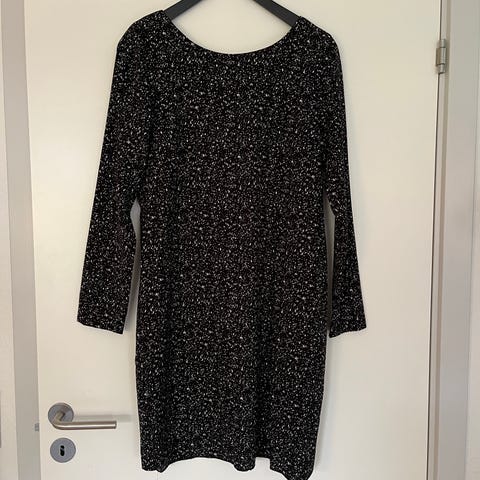 Flot kjole med åben ryg. Sort med hvide nister. Se foto. Lange ærmer.