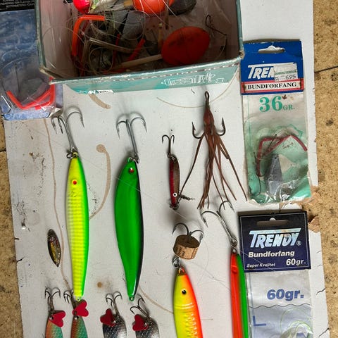 Blandet fiskegrej sælges samlet. Jeg har taget billeder af det meste af indholdet i tasken.