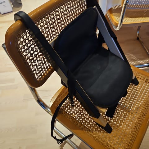 Insats, børne sele stol til voksenstol. Kan klappes helt sammen. Praktisk når man er på tur eller skal på besøg.
