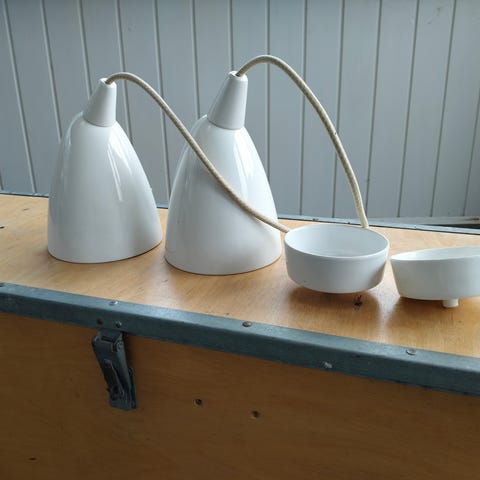 2 stk. sorte original BTC værkstedspendler med virer og glas/keramik fatning. Ø39 cm. Lettere brugt skader og BTC mærkerne er faldet af men BTC mærket fremgår på glas/keramik fatningen. (Ny pris ~ pr. Stk. 1.800) 1 stk 275 kr - 2 stk 400 kr.