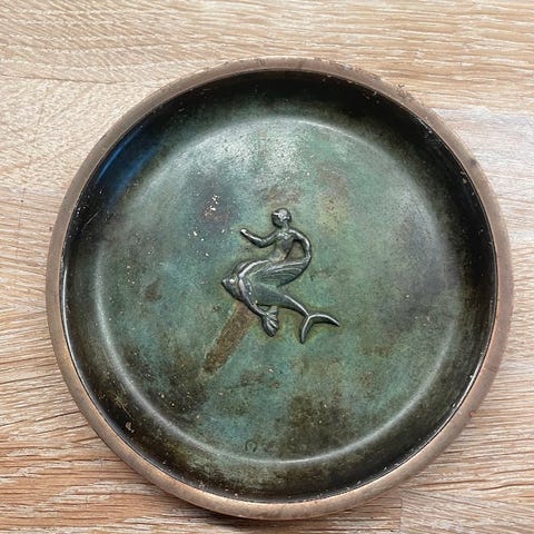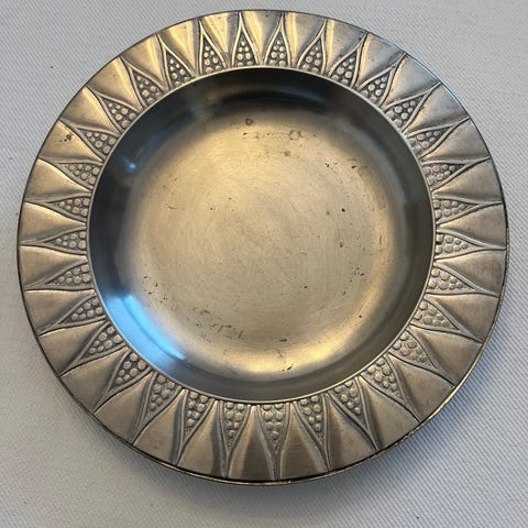 Gammelt tin fad fra Just Andersen mærket nr 2376. Diameter 28 cm
