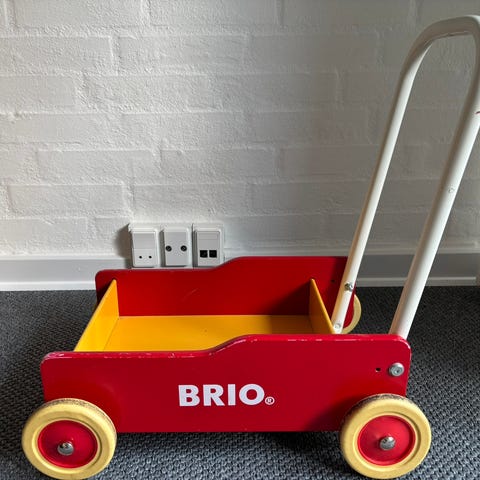 Brio gåvogn i rød/gul sælges. Der er brugsspor, da den har været godt brugt, men der er stadig mange timers leg i den.