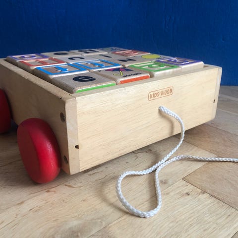 På klodserne er der tal, bogstaver og billeder. Fra røgfrit hjem uden husdyr.