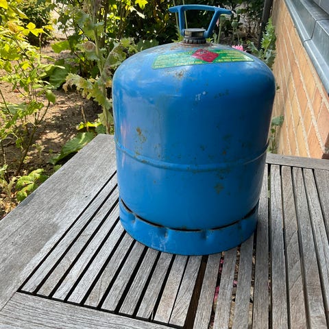 Et styk tre kilos blå gasflaske tom sælges til ombygning er ikke så pæn man skal jo bare byttes. Sælges for 200 kr.