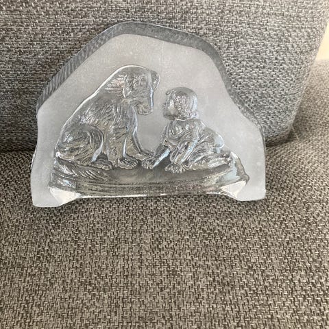 En glas figur af en bil lavet af gennemsigtigt materiale, sandsynligvis af tyk hård glas materiale.