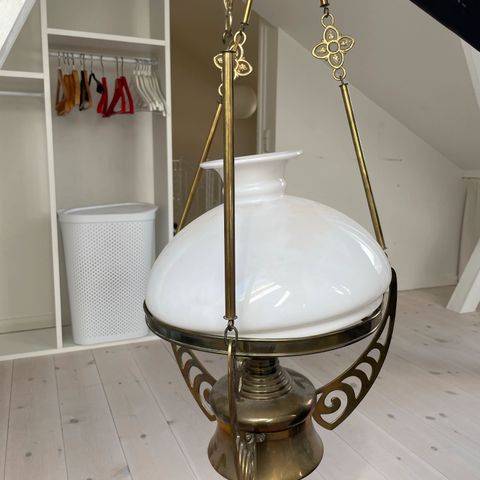 En smuk gammel loft lampe ( sikker på det været petroliums lampe) som er lavet til alm pære, vi bruger i dag ! Det nederste på lampen, hvidt m mønster, tror jeg poselæn?! Den er rengjort, så det øverste , Har den gul/ brune farve! Den super flot! Slået op flere steder! Sælges til højstbydende ! Byd endelig!