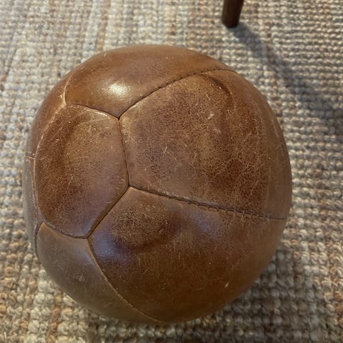 Unik vintage medicinbold i fuldkornet læder, vægt 1,5 kg. Bolden har en imponerende patina og er i perfekt stand – ingen fejl eller skader. En skøn detalje til træning eller dekoration.