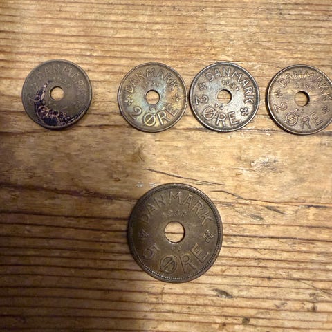 Samling af danske 1 øre, 2 øre og 5 øre. Årgange, antal og kvalitet er ikke noteret. Dog ses det, at 1 ørerne er fra mellem 1928 – 1964. 2 ørerne ligger mellem 1931 og 1971.