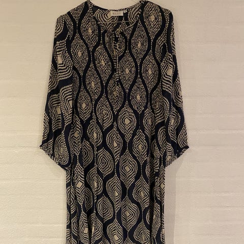 Kjolen er meget mørkeblå, næsten over i sort, med beige prikker.