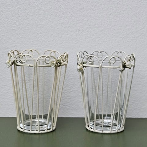 GLAS LYSE STAGER, FRANSKE, Jeg har disse 2 helt u ikke “Franske” glas lysestager, med et meget flot hvidt blomster. Og der medfølger et højt blåt firkantet lys.