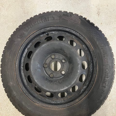Stål fælge med orginale navkapsler og Goodyear vinterdæk 205 60 16 ca 6-7mm mønster på