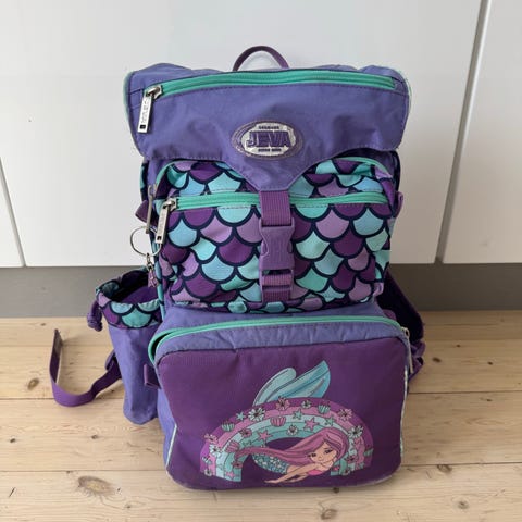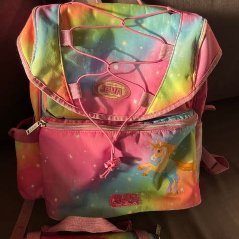 Sælger denne super fine JEVA skoletaske (2023 model) med farverigt regnbueprint og sød enhjørning.