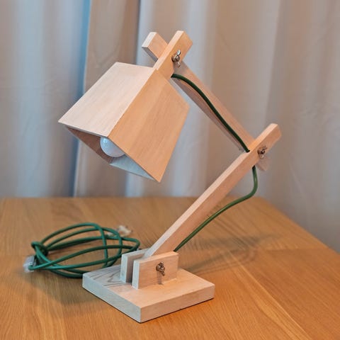 Bordlampe i træ med grøn ledning