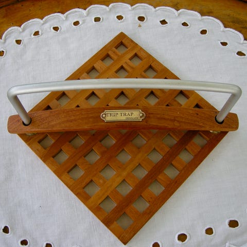Med fint lille Trip Trap logo skilt sat fast med søm og i fint ubehandlet Teaktræ