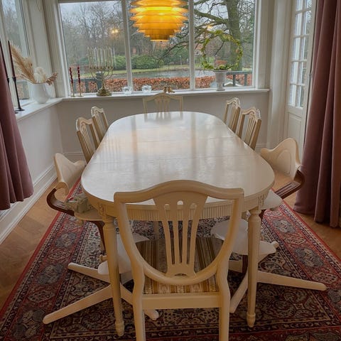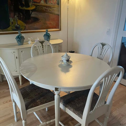 Super lækkert sæt i bedste kvalitet. Alt er hvidmalet træ. Ingen ridser. Det hele er som nyt. Fra et ikke rygerhjem.