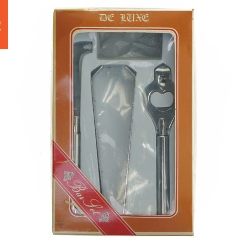 Flot sæt vintageåbnere til hjemmebaren, bestående af proptrækker, oplukker og citruskniv.