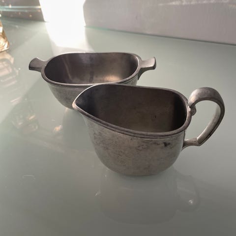 Art Deco kaffekande nr. 2421 udført i tin, med original flethank. Kanden er stemplet Just, modelnr. 2421.