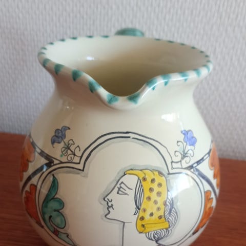 Smuk farverig, håndmalet vintage kande med et snoet håndtag og blomstermotiver. Den er i tung keramik