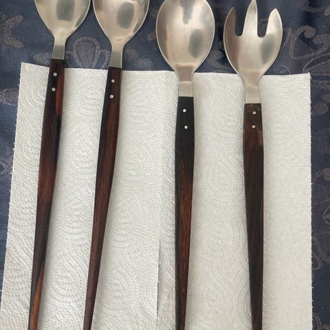 Bestik fra 60erne af rustfrit stål med teakskaft. Går til omkring 60-80 pr del. Men jeg sælger til 55 pr del. Eller det hele for 1800 kr.
