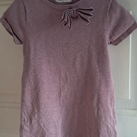 finstrikket lyserød kjole i blød bomuldsblanding med indvævet glittertråd og fastsyet sløjfe foroven. Passer til str. 110-116, ca. 4-6 år. Kan sendes.