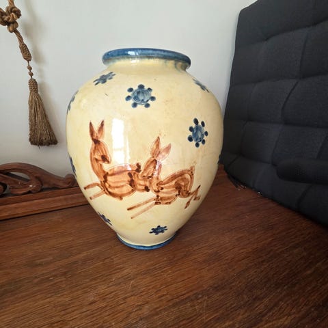 Rigtig skøn vase fra #humlebækkeramik. Dejligt organisk relief med hjorte og sivlignende vegetation. Dyb mat blå glasur med hvide udtræk på kanterne af relieffet.