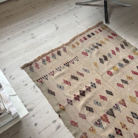 Håndvævet kvalitetstæppe i sandfarvet og råhvid med naturlige nuancer. Tung og slidstærk kvalitet (2.200 g/m²). Ægte dobbeltvævet og identisk på begge sider. Fra røg- og dyrefrit hjem.