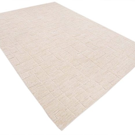 Håndvævet tæppe. Sandfarvet + råhvid, med naturlige nuancer. 2.200g/m². Kan vendes og er ens på bagsiden.