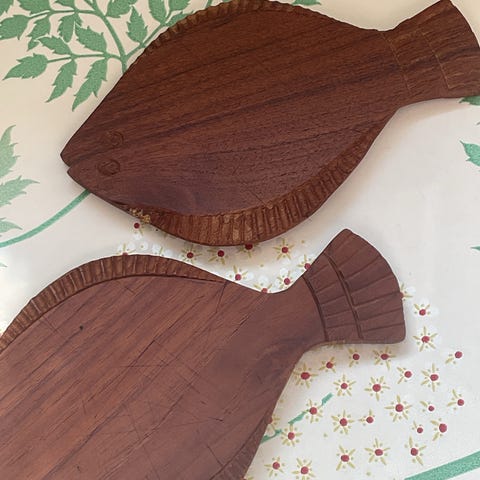6 stk.Smørebrikker i teak finer med indlæg af træ kone og med teksten " Haa do wot i Hobrow".