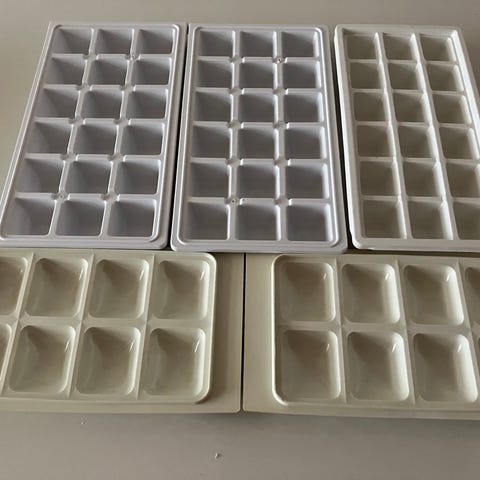 Isterningebakker, Jeg har 5 isterningebakker, 2 af dem med låg, som jeg sælger. De fejler intet.