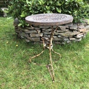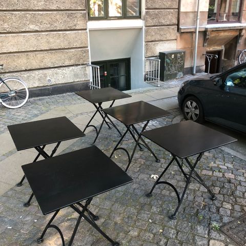 Cafebord - B 60 - L 70 - H 74 - sortmalet støbejerns fod og bordplade af træ, Bordet har naturlig brugspatina. Hvis anden bordplade ønskes kan køber let skifte til anden model - rund ? Bordet vil passe perfekt til terrassen - altanen - som ekstra bord - den helt rigtige renvaskede rødternede dug følger med - flere borde haves - kan evt. leveres i Kbh. eller ?