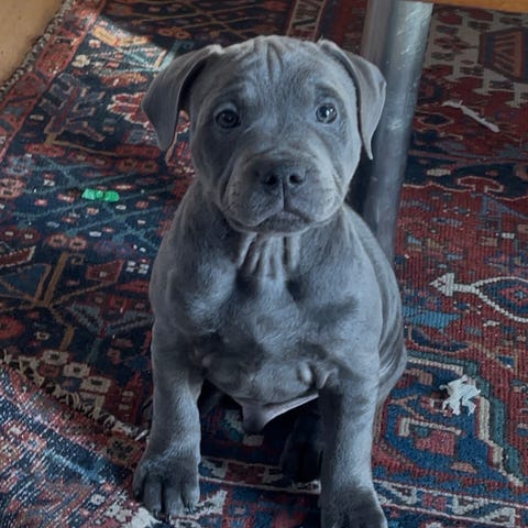 Frio er fuldblods staffy, har alle sine vacciner og sundhedstjek i orden og lever som en elsket del af vores familie, som består af Vicktoria, Davis og vores lille datter Sophia, født den 3. januar 2025.