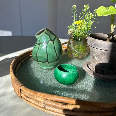 Ca 13.5cm høj og 14 cm i diamanter på det bredeste. Stort set ingen fejl.