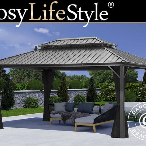 Elegant havepavillon med et smukt og solidt metaltag med flot kiphøjde og ventilationsåbning samt sidevægge/gardiner og myggenet. Pavillonen danner en smuk ramme for ethvert udendørs arrangement herunder middage og grillfester, men fungerer også fremragende til ren afslapning, hvor man har mulighed for at nyde haven endnu mere – også selv om vejret ikke viser sig fra den bedste side.
