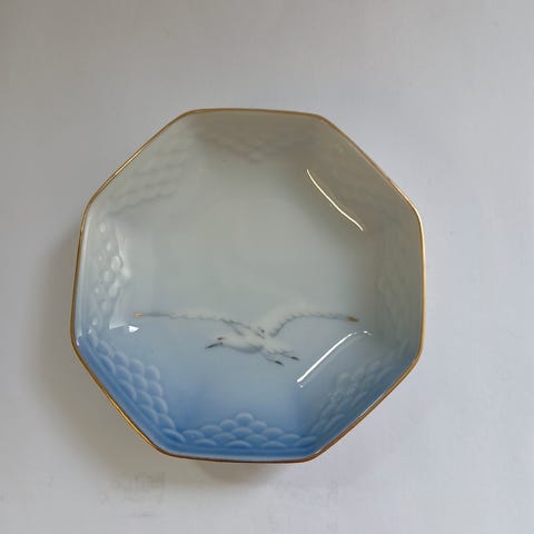 Porcelæn, lille skål på lad fod, B&G, Mågestel med guld kant.