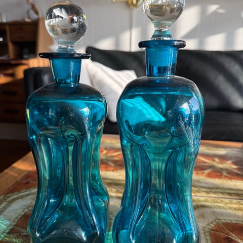 Holmegaard Klukflaske karaffel i klart glas med rund prop og bølgede detaljer højde 28 cm 250 kr