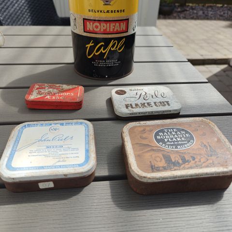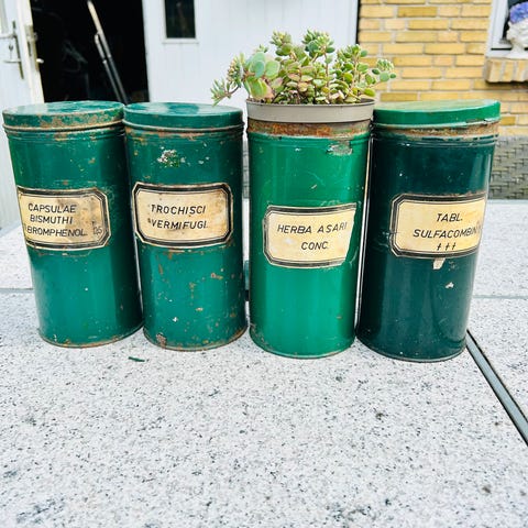 Fire flotte håndmalede dåser fra gl. apotek.