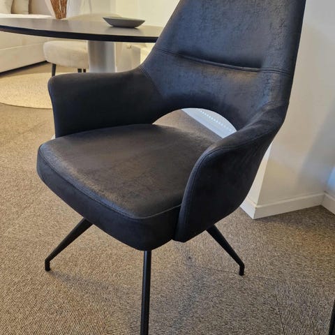 Lotte spisebordsstol med drejefunktion i mørk blå, lys brun eller mørk brun blødt bull stof eller sort eller cognac semianilin læder.