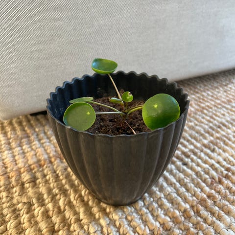 Helt nyplantet Pilea stiklinger i terrakotta krukker. De skal nok gro hurtigt og hurtigt blive fyldige. Er nemme og passe.