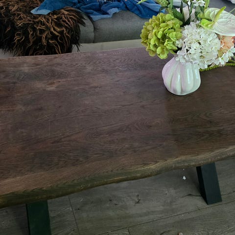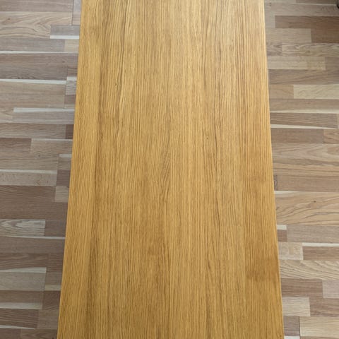 Sofabord fra Bolia med understel i hvid pigmenteret eg og bordplade i lyseblå laminat.