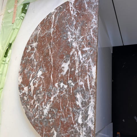 Fin marmor-plade med let fordybning mod midten. Bruges f.eks. som underlag til andre ting: sten, figurer, barbergrej osv.