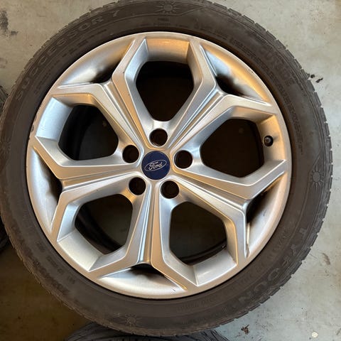 Originale 18" Ford fælge med vinterdæk. ET 55, Bridgestone Blizzak LM005 2,5-2,7 mm mønster. Monteret med TPMS ventiler. Fælgene er 8" brede.