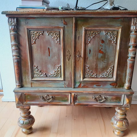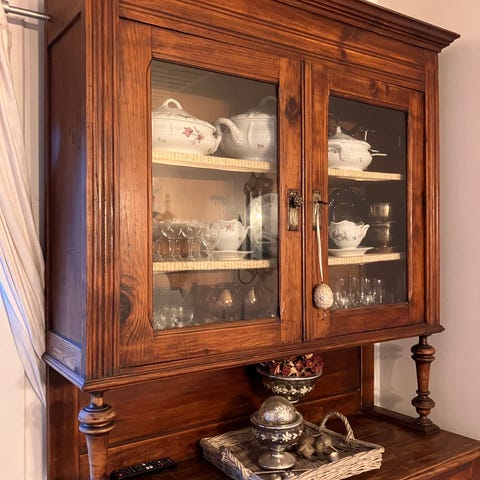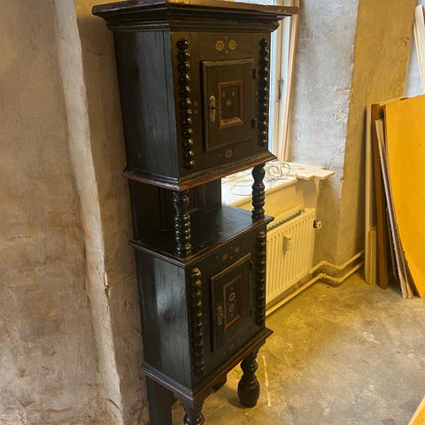 Udstillingsskab , træ, 125 år gl., Smukt antikt udstillingsskab, sandsynligvis fra slutningen af 1800-tallet eller begyndelsen af 1900-tallet. Denne datering baserer jeg på udsmykningen øverst på skabet.