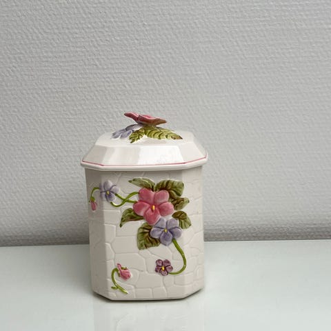 Mexicansk lågkrukke i god stand. Den har et enkelt hak i kanten under låget, men uden betydning- se foto. Den måler 12 cm lang, 6 cm høj og 7,5 cm bred.