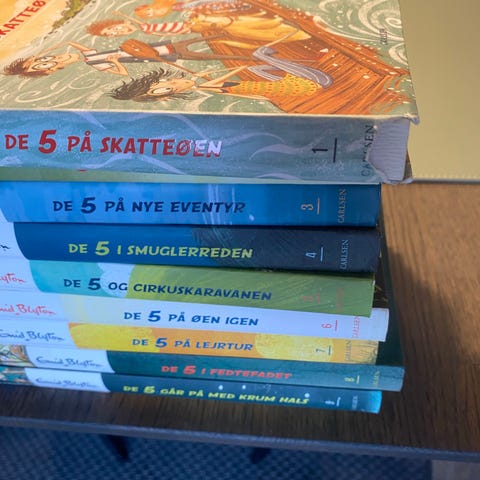 Billede 5: DE 5 på vandretur - har det fedt- ved havet. PÅ skatteøen - på nye eventyr- stikker af. I smuglernes hus - og cirkuskaravanen- på øen igen. og spionerne. Samlet kr. 75