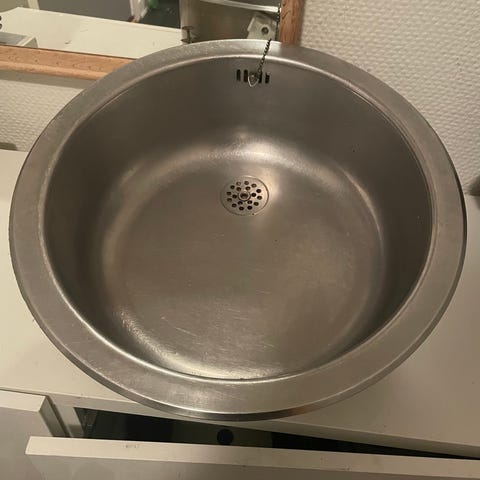 Lille rund vask til montering på bordplade måler 40 cm i diameter og 15 cm. Høj, den har ikke været monteret .