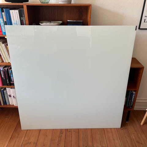 Mobil skrivetavle i glas med lysegrå stofbeklædt lydabsorberende bagside.