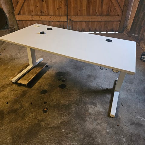 Dejligt stort skrivebord som er velegnet til også og stå i hjørner. Det er hæve/sænkebord.