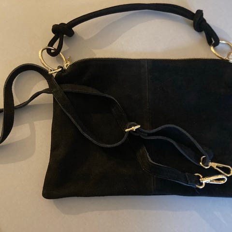 Lækker blød sort skindtaske fra Birkmond. Mål: 39cm høj x 36cm bred. Forlomme og 3 lommer indvendig. En med lynlås. Nypris 1499, nu 895,-